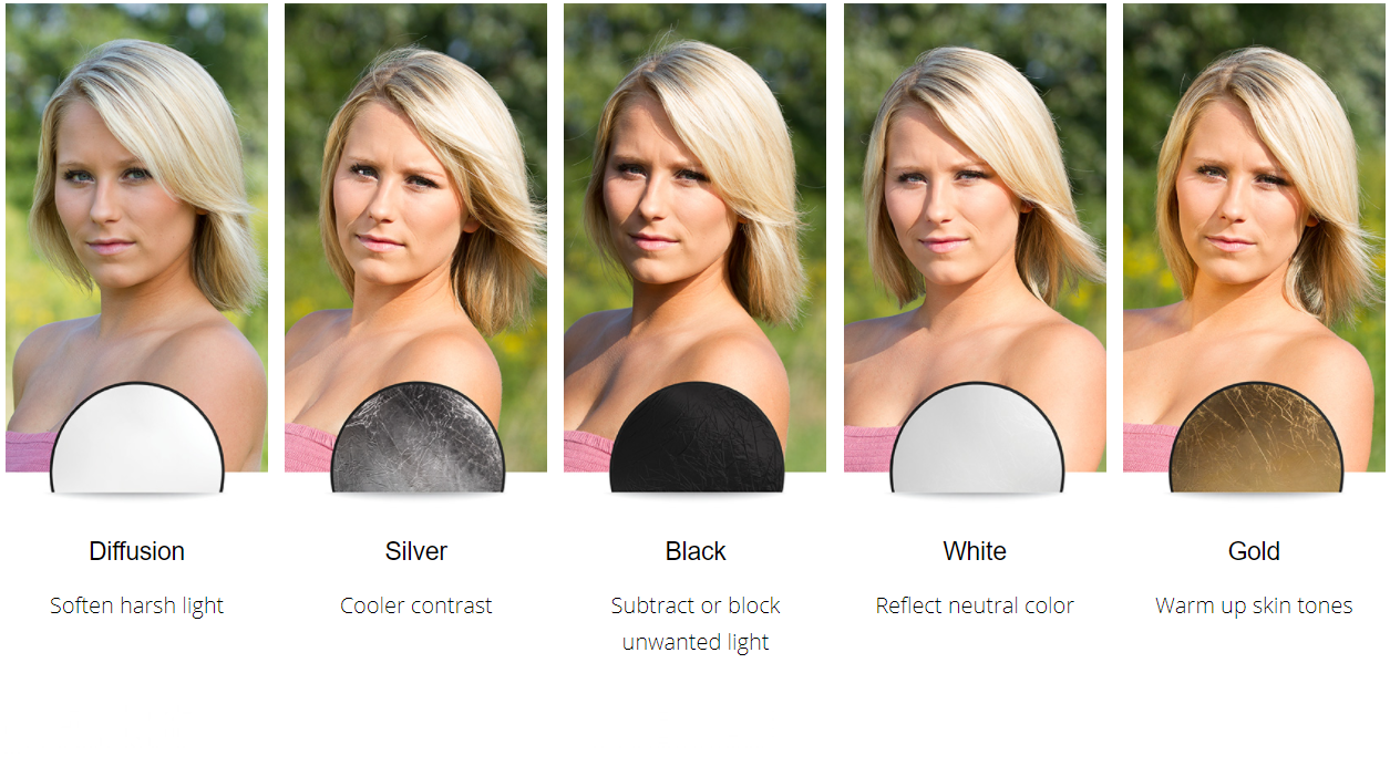 These 5-in-1 reflectors offer 5 surfaces that allow you to diffuse light and reflect in various colors. They are available in two options: Sunlight, Silver, Black, White, and Diffusion, or Gold, Silver, Black, White, and Diffusion.