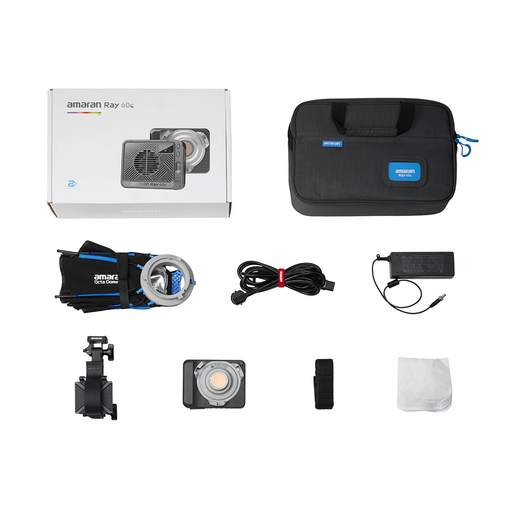 Complete Mobile Lighting Kit The amaran Ray 60c comes as a ready-to-shoot kit, including the all-new amaran Octa Dome 30 softbox and accessories, Ace Lock to Baby Pin Adapter, Power Adapter, and Cable, all in a dedicated bag – so you get a complete lighting setup wherever you create.