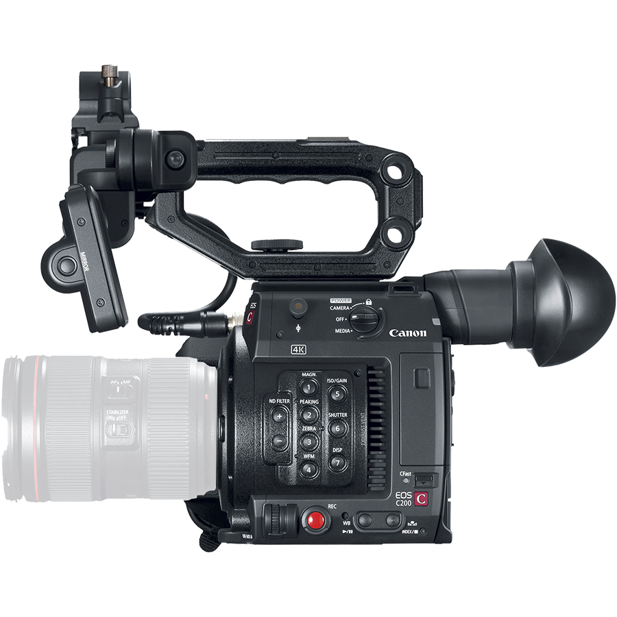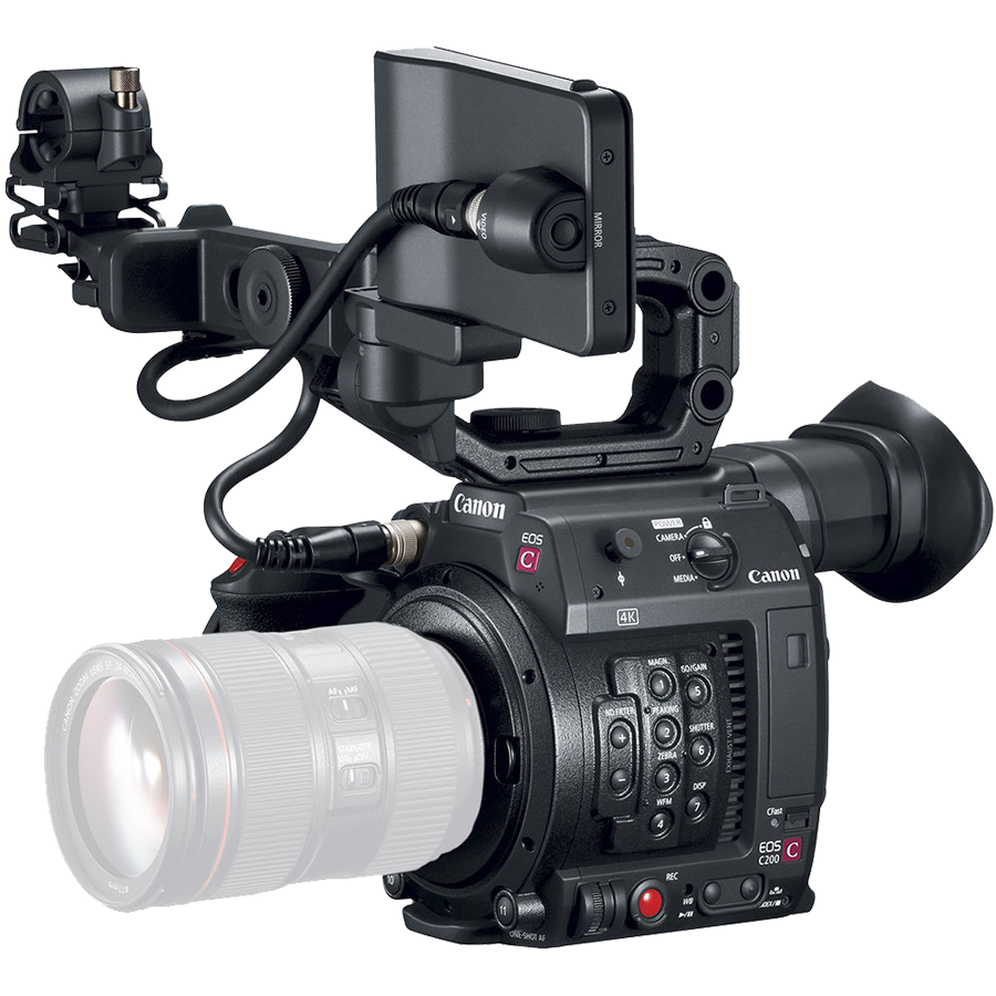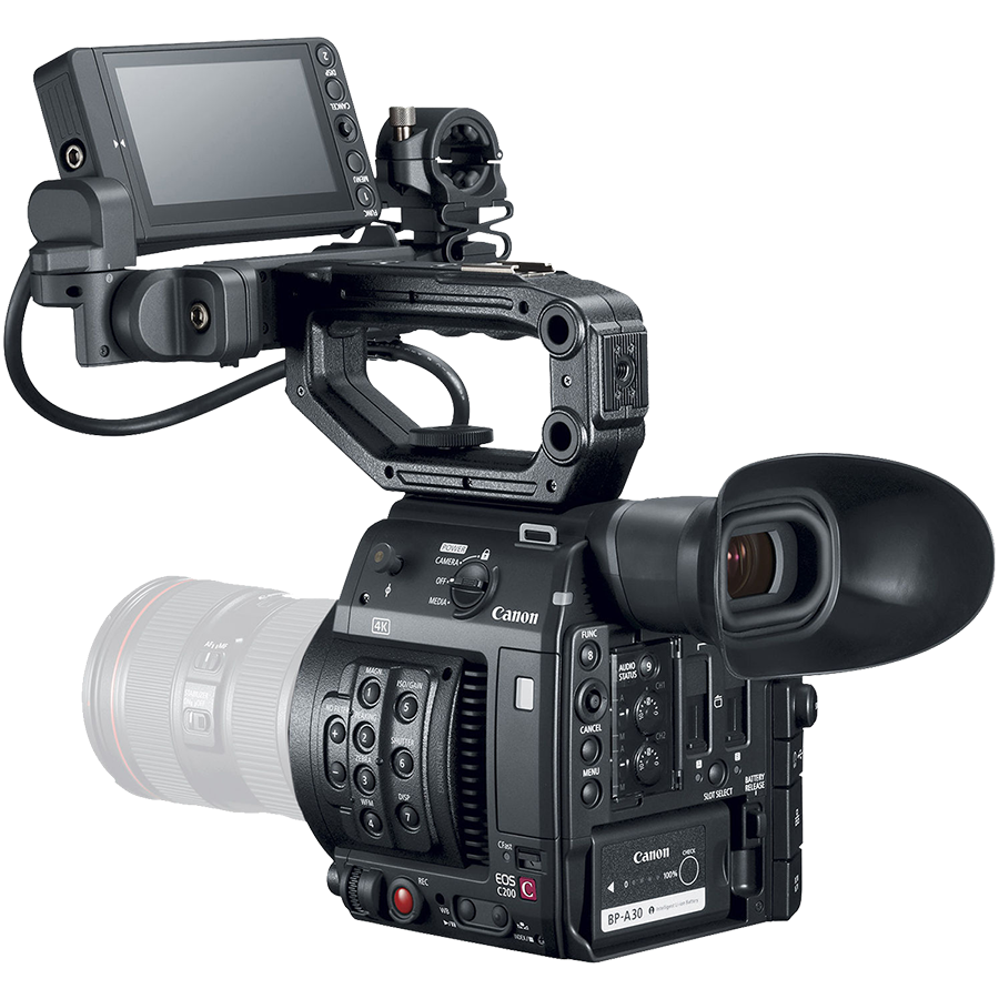 The EOS C200 Digital Cinema Camera is a "ready-to-go" production camera that comes with a built-in electronic viewfinder and an array of accessories including a 4-inch touch screen LCD monitor, a versatile handle and ergonomic handgrip. The camera can record internal 4K RAW to a CFast™ 2.0 card in our new Cinema RAW Light format without compromising detail, as well as 4K UHD and Full HD in MP4 format to SD cards. The 8.85 Megapixel Super 35mm CMOS sensor, 13 stops of dynamic range, Dual Pixel CMOS AF, full compatibility with Canon EF-mount lenses, and HDR capability help make the EOS C200 ideal for film, documentary and television production, corporate and event videography, and newsgathering. The camera's multitude of features helps deliver outstanding image quality, performance and versatility.