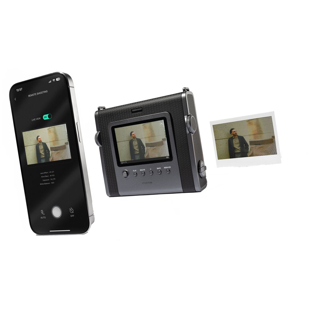 Both Hybrid Instant Camera and Smartphone Printer in a single device. Simply choose a photo stored on your camera and print it! You can even print instax™ photos from your camera roll on your Smartphone!
