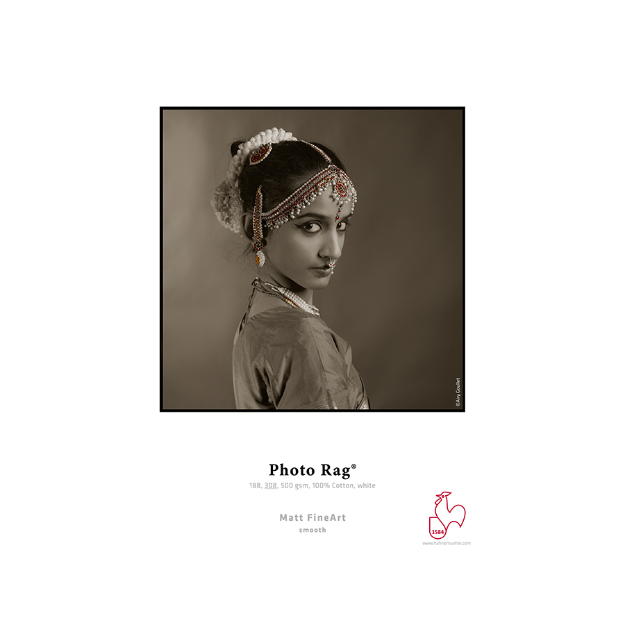 Hahnemühle Photo Rag® is one of the world’s most popular papers and the valued all-rounder for high-quality FineArt inkjet printing. The white cotton artist’s paper, with its characteristic, wonderfully soft feel, boasts a lightly defined felt structure, lending each artwork a three-dimensional appearance and impressive pictorial depth. Combined with the matt premium inkjet coating, this paper produces outstanding prints that feature brilliant colours, deep blacks, striking contrasts and perfect reproduction of detail. This acid- and lignin-free classic meets the most exacting requirements for age resistance and is specially designed for FineArt applications. Whether it is used for FineArt photography or art reproductions, the ideal combination of structure, print quality and weight makes Photo Rag® one of the most versatile FineArt inkjet papers.