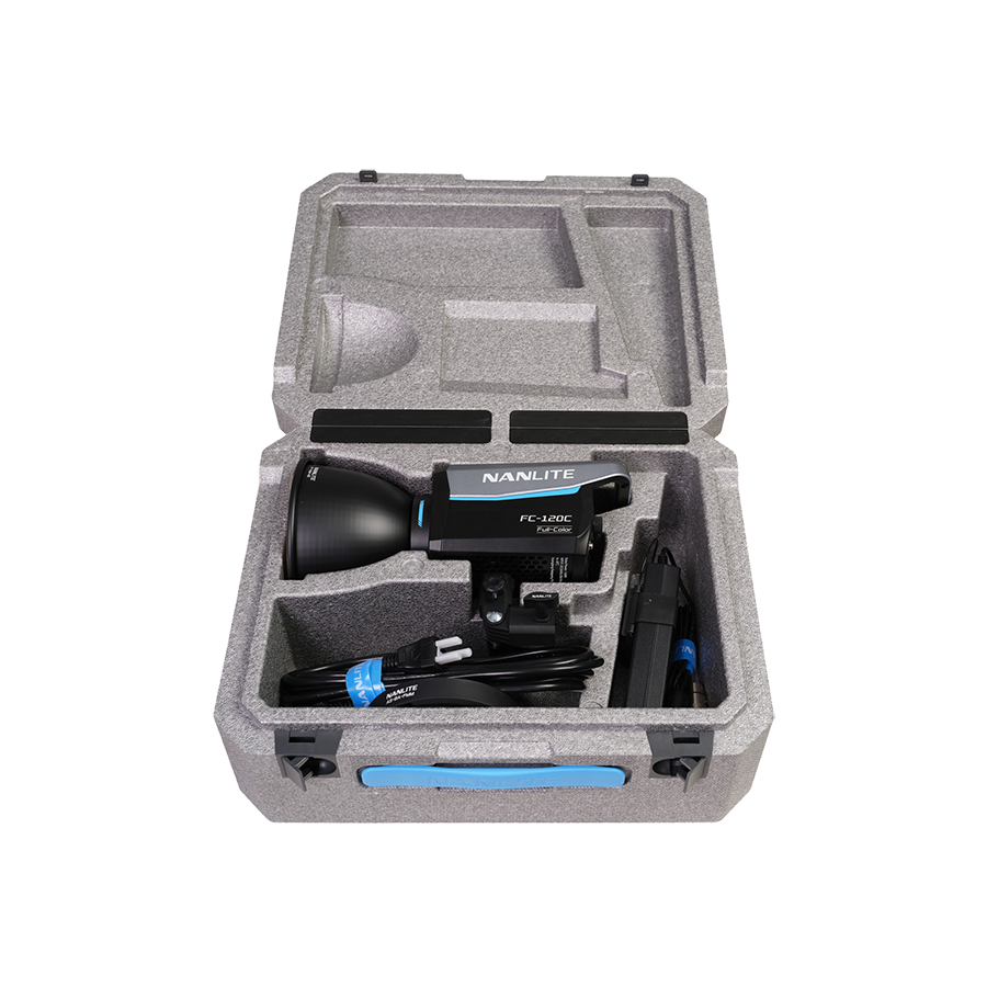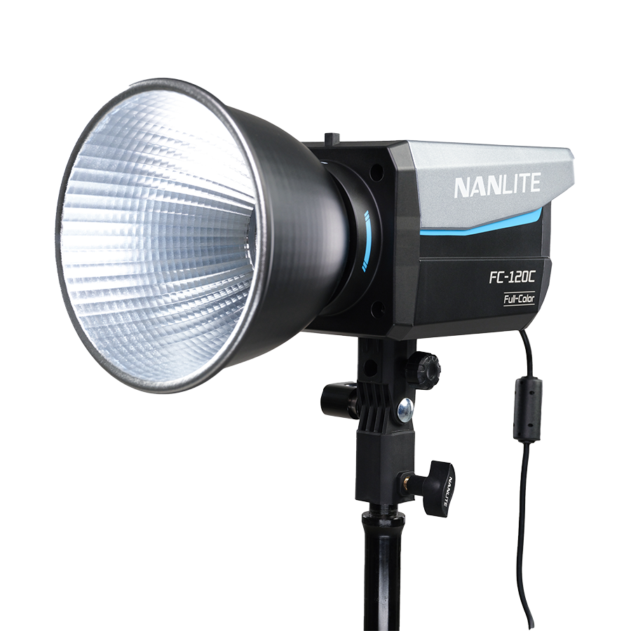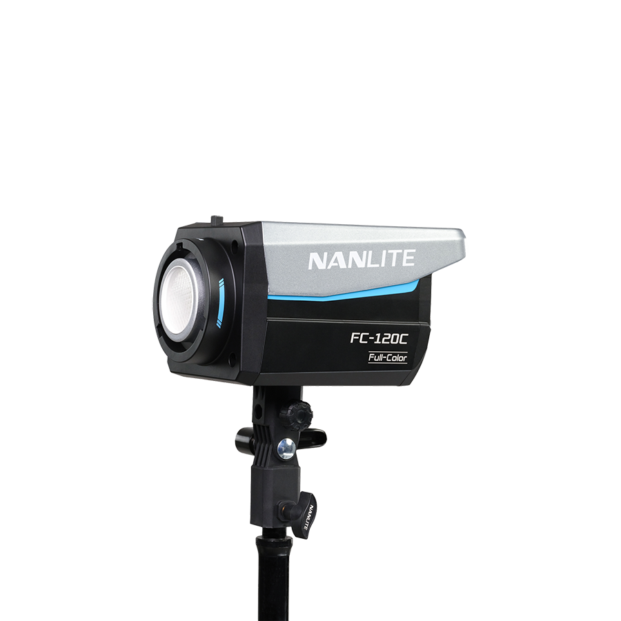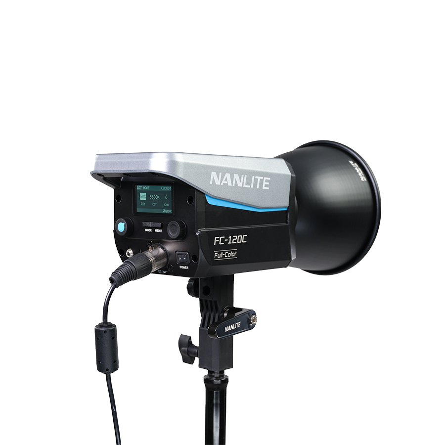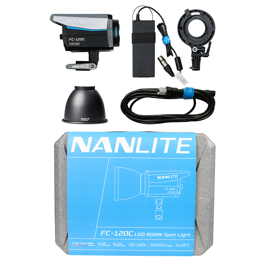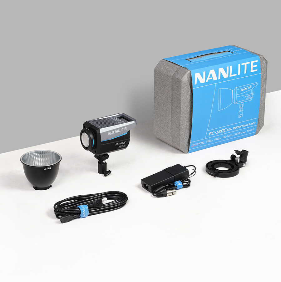 The Nanlite FC-120C is a surprisingly compact and lightweight LED spotlight that provides full RGB color and a wide CCT range of 2700K–7500K, and even though it's small and light, it cranks out 12850 lux, 1193 fc @1M 5600K with included reflector. FC-120C runs on batteries, powerbanks, or AC and delivers highly accurate light and a versatile array of control methods: onboard, Bluetooth, 2.4G, and DMX/RDM.
