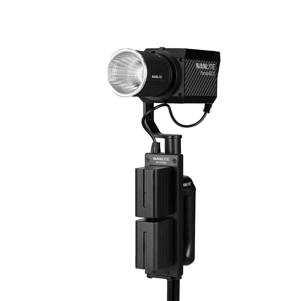 - Battery Advancements Forza 60 II provides a more efficient use of battery power: it gets up to 90 mins at 100% brightness on 2x NP-F970 batteries (up from 70 mins) and 120 mins at 100% on 1x 14.8V 160WH V-Mount battery (up from 110 mins). Batteries sold separately.