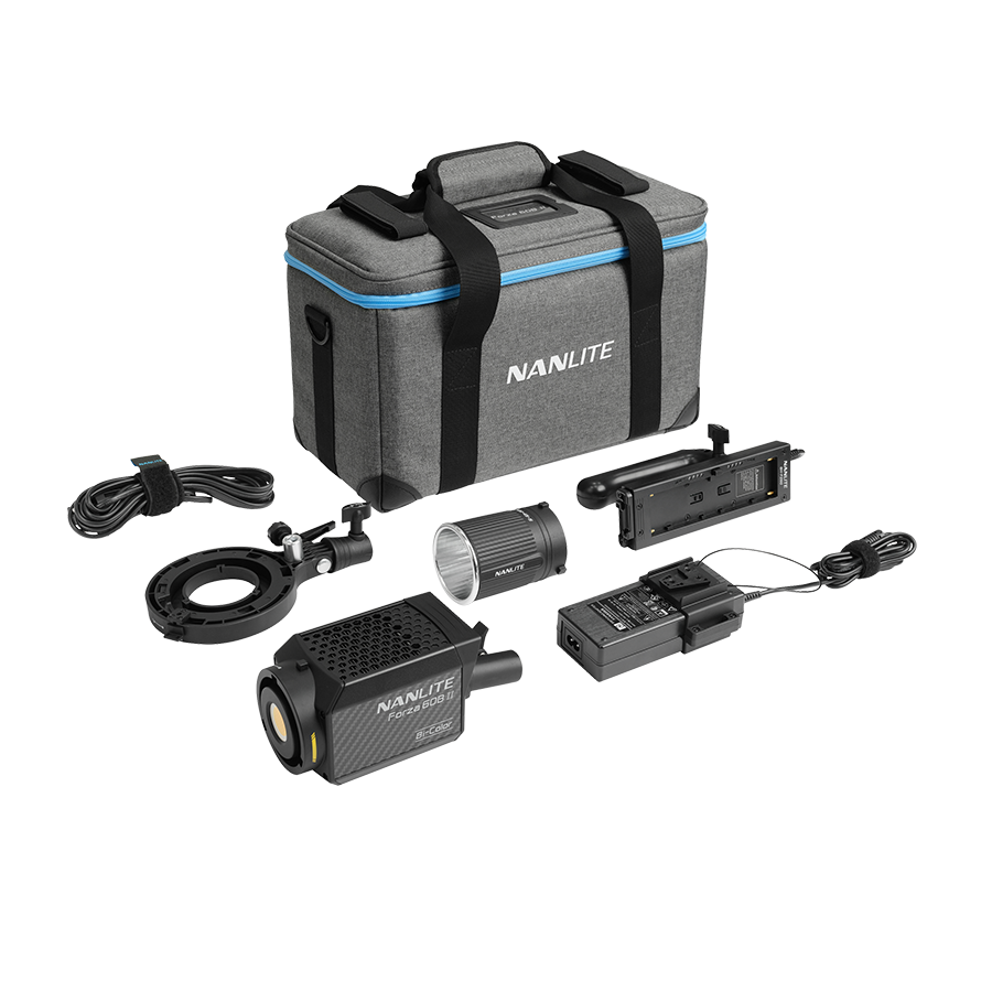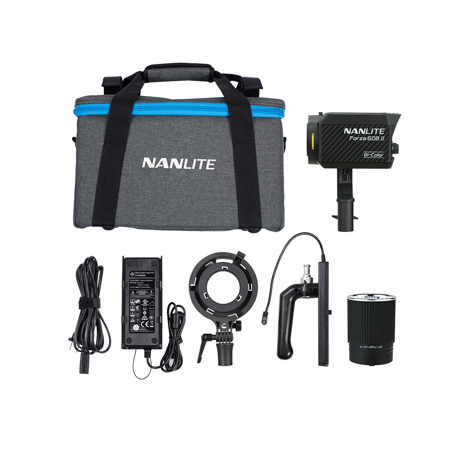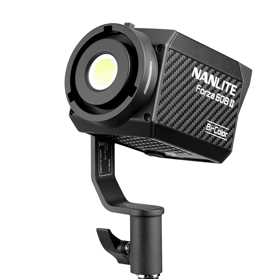 The Nanlite Forza 60B II Bi-Color LED Spotlight is small enough to fit in one hand, yet powerful enough to provide 14350 Lux, 1333 fc of 5600K light at 1 meter, and a versatile color temperature range of 2700K-6500K. It's ready for professional production with a durable build quality, control options for Bluetooth, 2.4G, and DMX/RDM, a glass-protected COB, a compact AC adapter, and the ability to run on a V-Mount battery or NP-F batteries with the included BH-FZ60 handgrip (a V-Mount handgrip is sold separately).