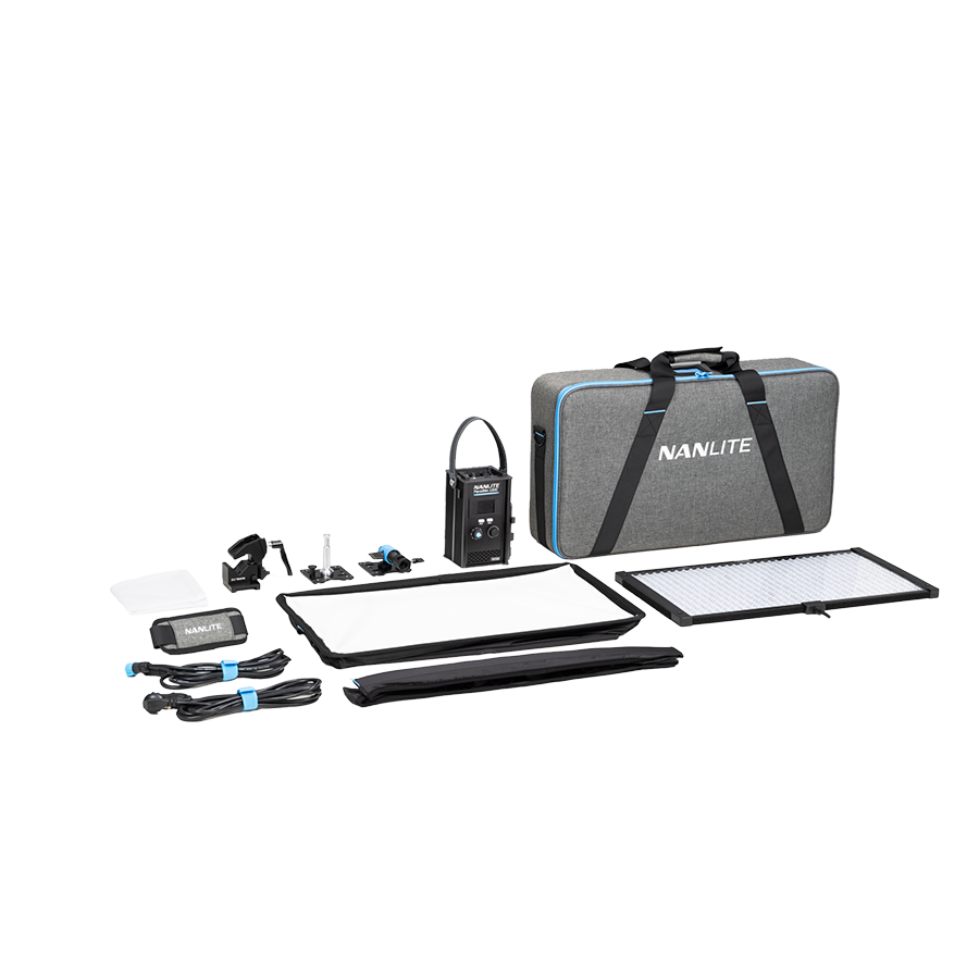 Comes with a quick-open softbox, two diffusers, an eggcrate grid, a control unit, clamps, mounts, and a padded carrying case