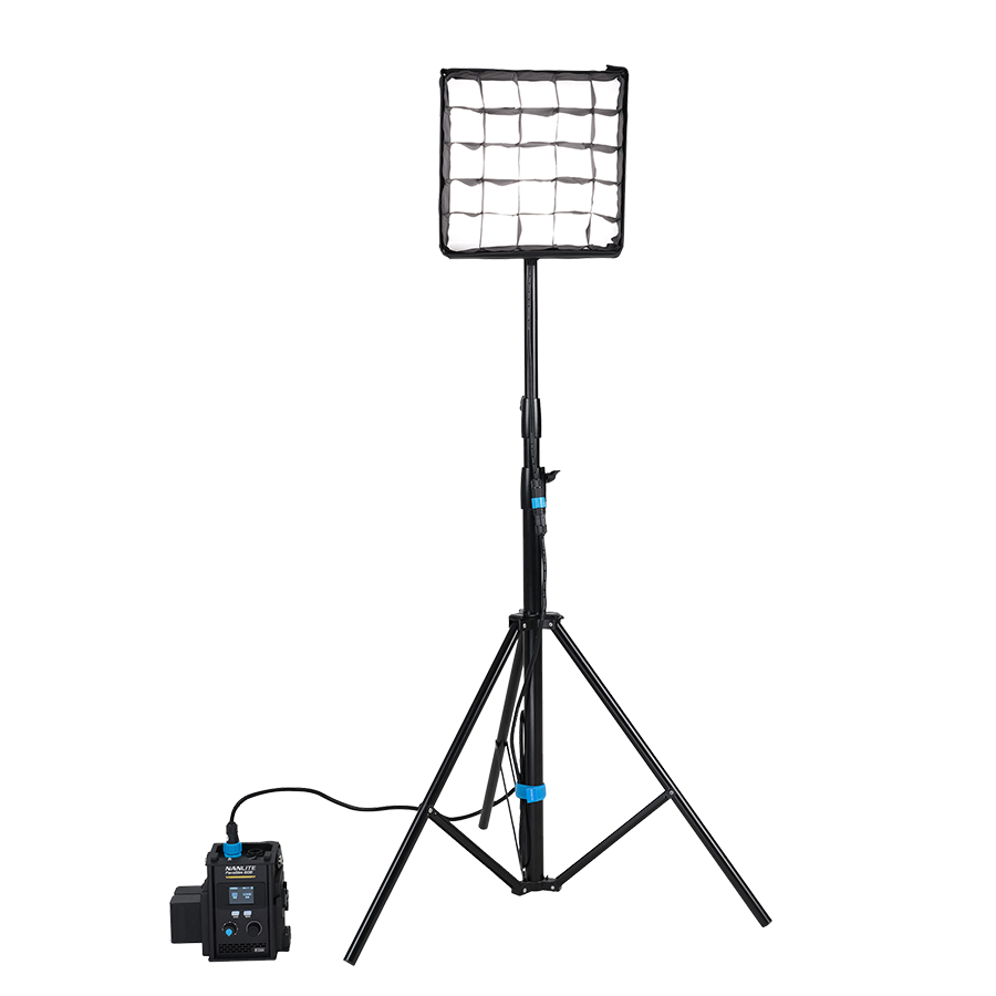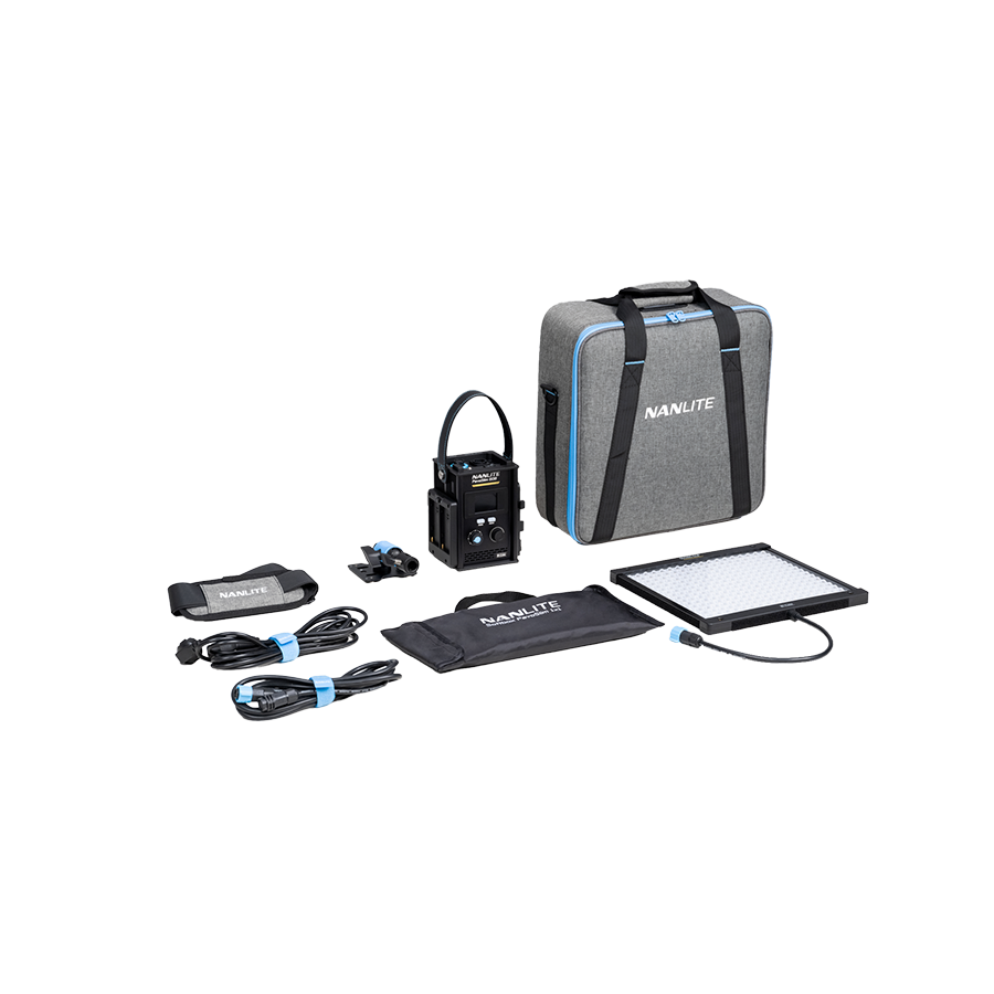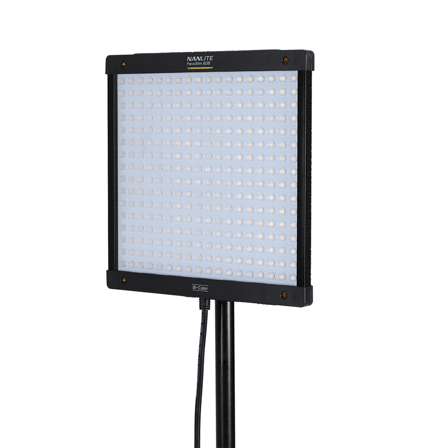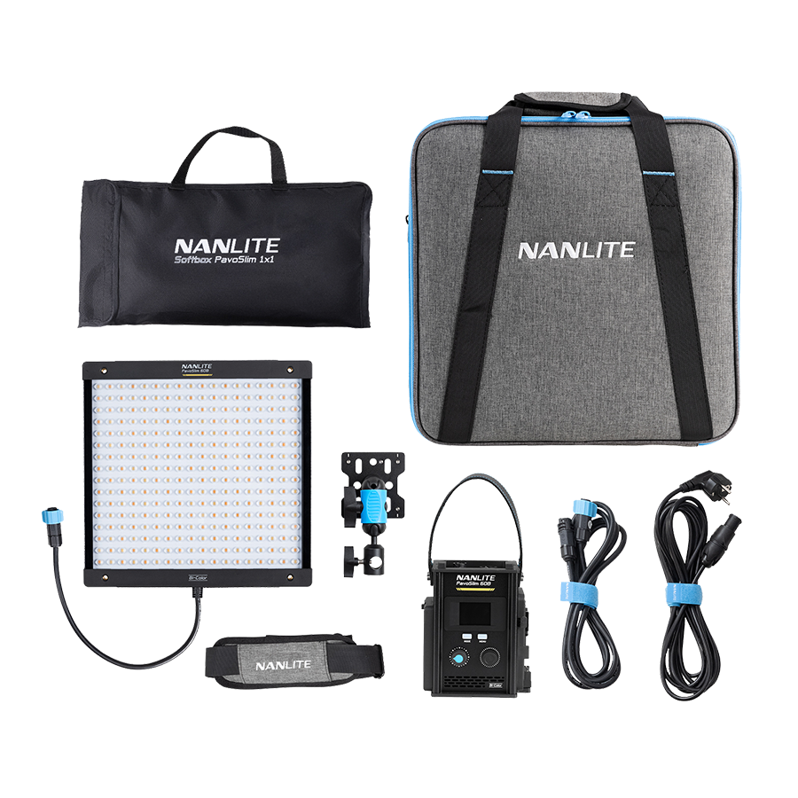 The Nanlite PavoSlim 60B is an exceptionally thin and lightweight 1x1 LED panel light that provides impressive output (8156 lux, 757.7 fc @1M 5600K), 0–100% dimming, a bi-color CCT range of 2700K–6500K, power through AC, NP-F or V-Mount battery, and includes a Control Unit, softbox, 2 sets of diffusion, eggcrate grid, a swivel mount, and a compact padded carrying case that safely holds everything.
