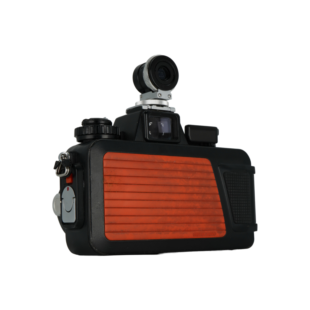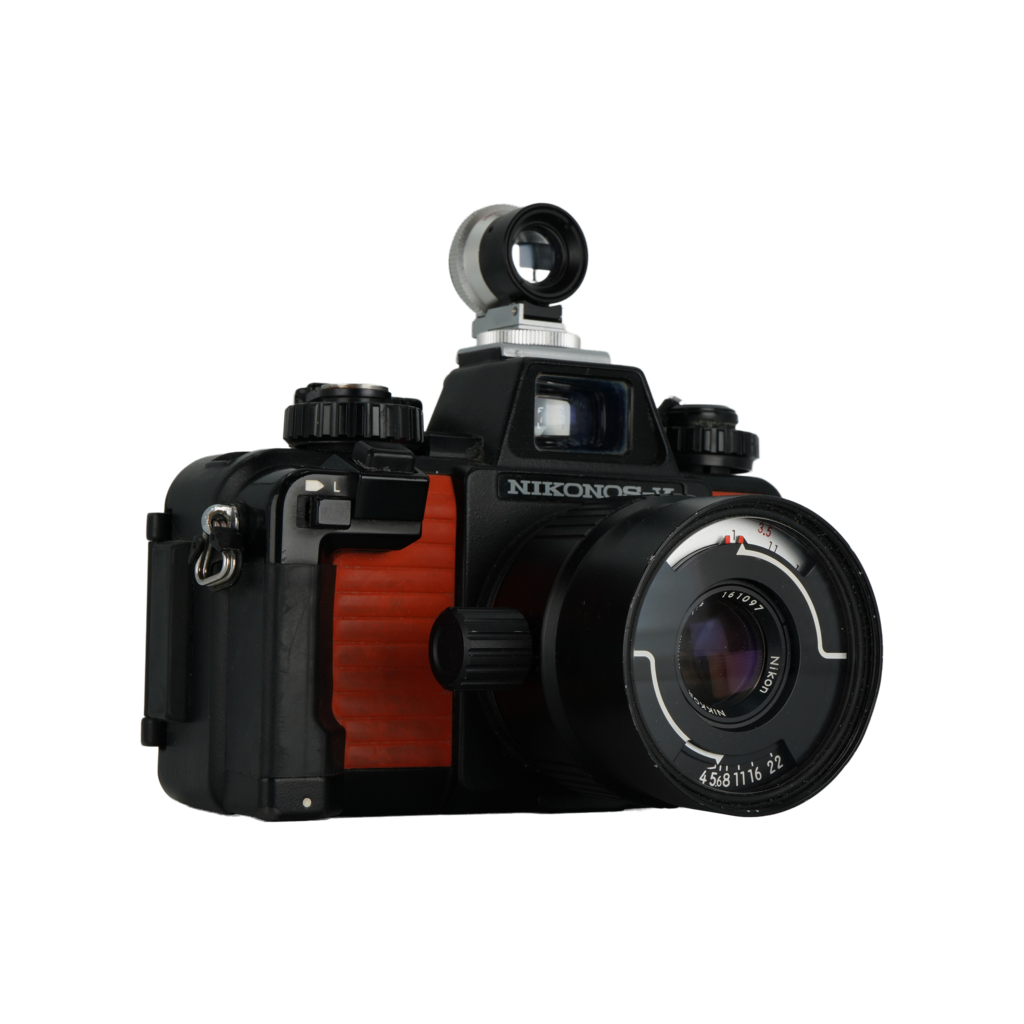Nikon os-V 35mm film underwater dive camera, os 35mm f/2.5 Dive lens, and os 80mm f/4 dive lens.