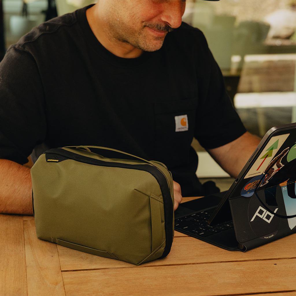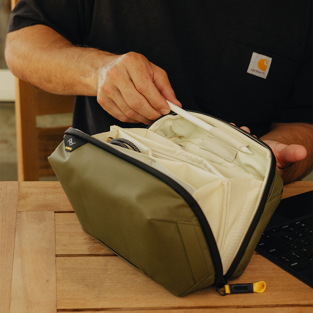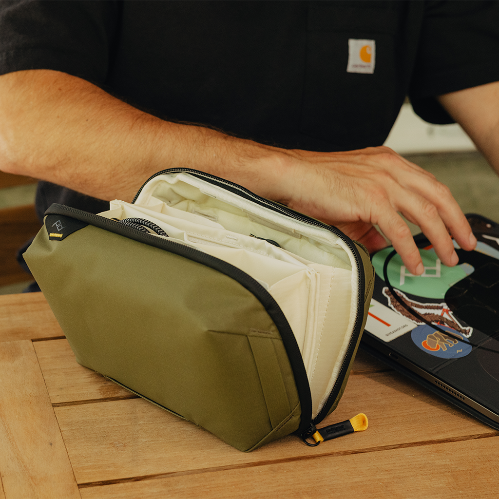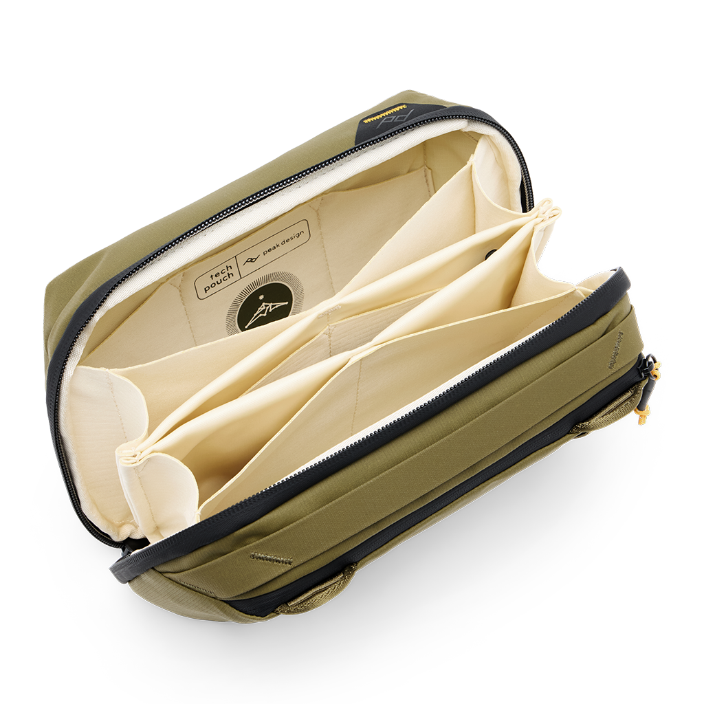 Whether storing cables, everyday gear, or travel essentials, Tech Pouch offers unrivaled organization and ease of access. Origami-style pockets create enormous spatial efficiency, letting you pack more into a smaller space while keeping your items neatly organized and easy to find. Elastic accessory loops keep items like pens, knives, SD cards, and batteries always within reach. Exterior handles and a clamshell-style opening make this pouch a delight to hold and access. External zip pocket has a cable pass-through for easy device charging. The 200D recycled nylon canvas shell is weatherproof and aesthetically clean.