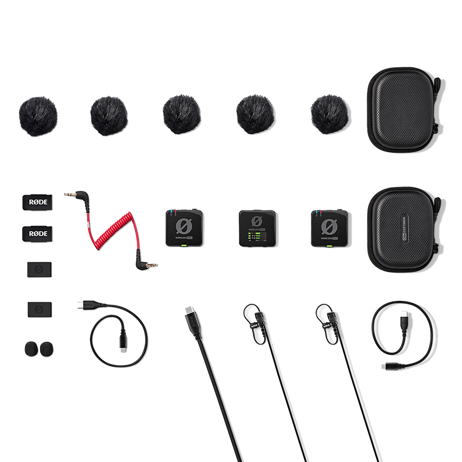 - Complete accessory kit, including smart charging case, two Lavalier II microphones, cables, MagClip GO magnetic mounting clips and accessory case