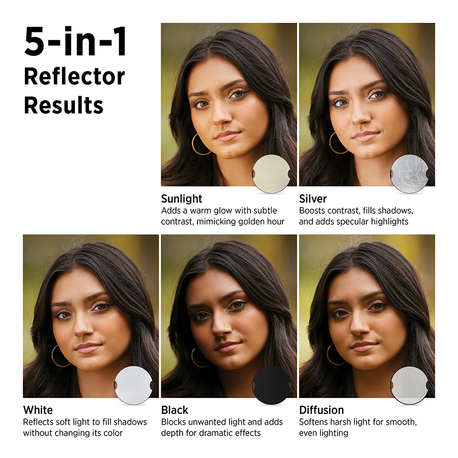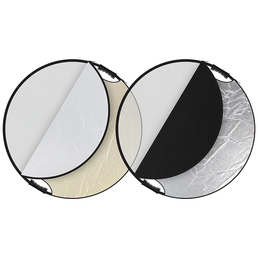 These reflectors are the fastest, most affordable way to control light for portraits, still life, and video interviews. Control contrast, shadows, light direction, and more with 5 versatile surfaces. It pops open instantly and features handles for easy positioning, offering portable light control on-location and in studio.